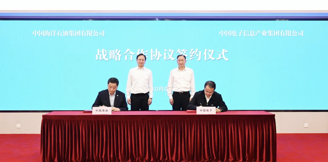10月9日,中国电子与中国海油在京签署战略合作协议。中国电子党组书记、董事长李立功,中国海油党组书记、董事长张传江见证协议签署。中国电子党组成员、副总经理谢庆林,中国海油党组成员、副总经理俞进代表双方签约。